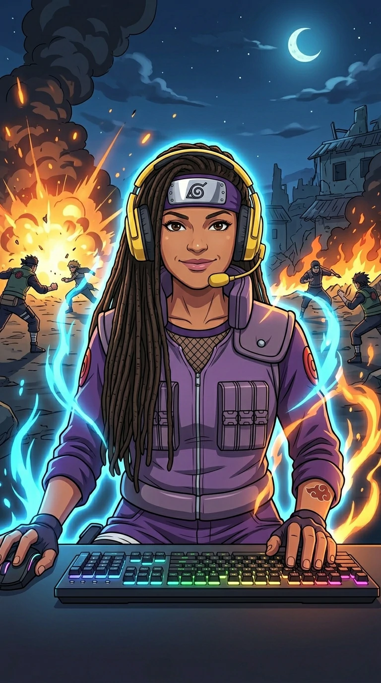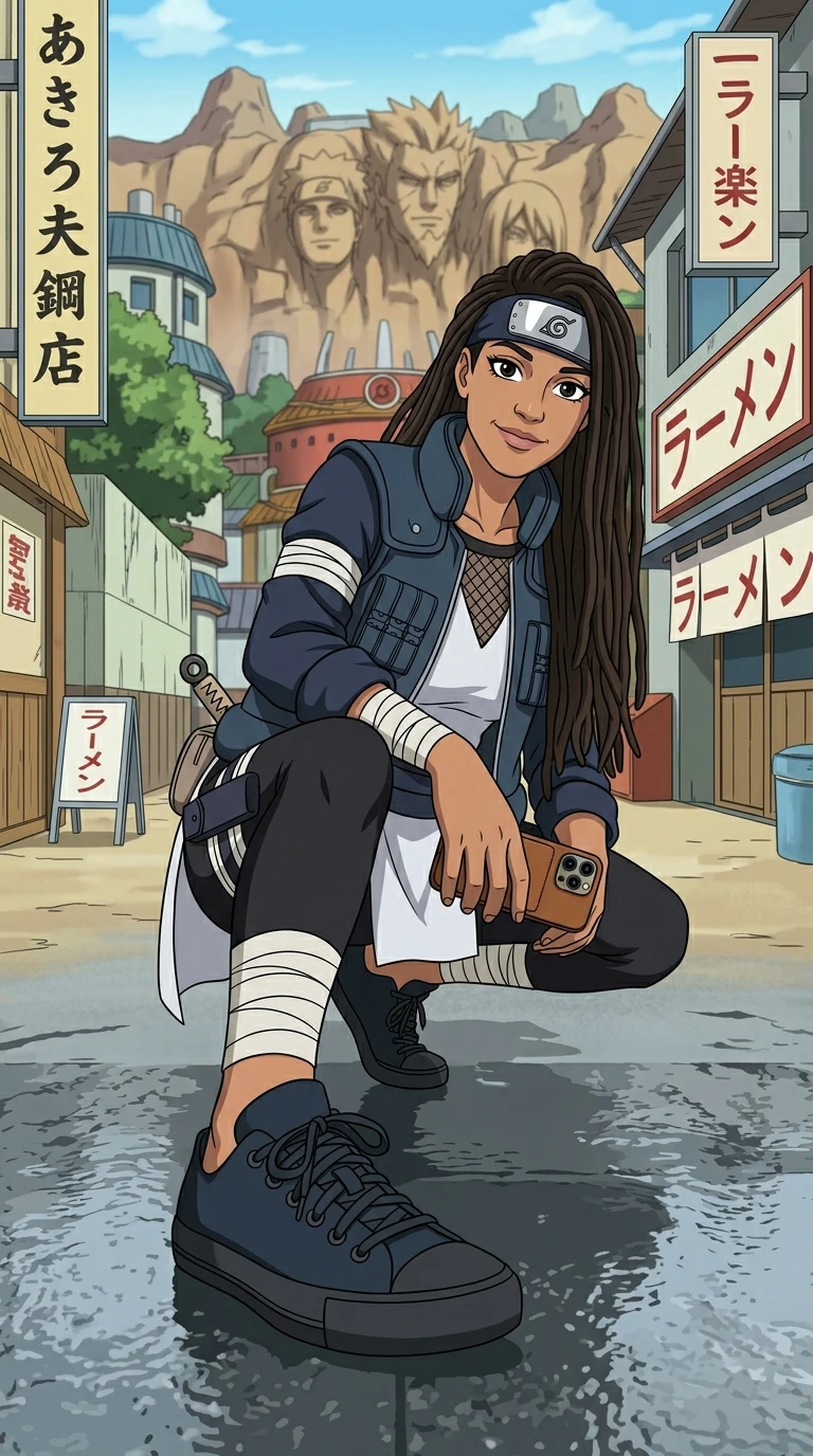 Convert the provided photo into a Naruto-inspired anime character, keeping the person's facial features, gestures, and expressions as closely as possible. Maintain the unique hairstyle, clothing, and accessories of the person, but adapt them to a ninja style typical of the Naruto universe. The eyes should be exaggerated with bold outlines, capturing the emotional expression of the person, and the skin tone should be adapted to match anime aesthetics. Keep the person's pose and character traits intact, but place them in a simple Naruto-themed background, such as a village or a training ground. The clothing should reflect the individual's personality while incorporating ninja elements, like headbands, and signature outfits typical of Naruto characters.